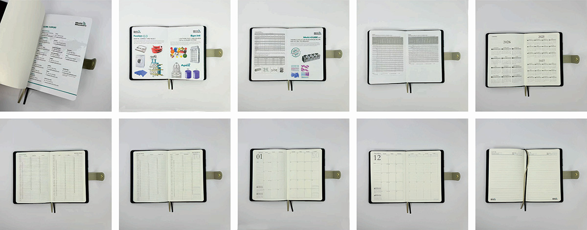 •柔軟なデザインとカラーパレット: 表紙のアクセントやストラップの色から内部のページレイアウトに至るまで、すべてをカスタマイズしてブランドの外観を統一します。共鳴する一貫したアイデンティティを作成します。